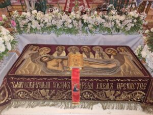 Благообра́зный Ио́сиф, с дре́ва снем пречи́стое те́ло Твое́, плащани́цею чи́стою обви́в, и воня́ми во гро́бе но́ве покры́в положи́.